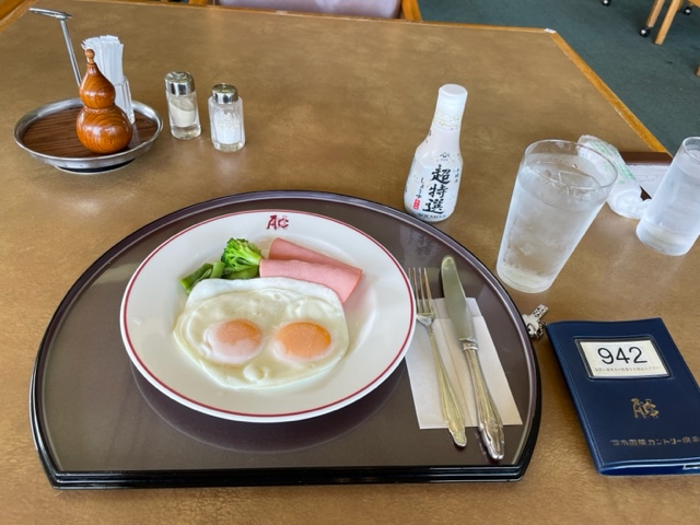 まずは、レストランにてハムエッグを食しながら、独りミーティングです。この時、先週、縁のA.Oさんから承った宿題の結果ご報告を申し上げます。