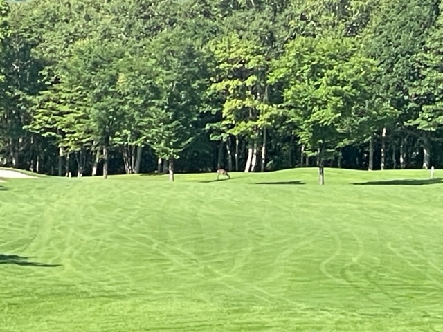 9番ロングはボギー。30センチに3オンしたS.IさんがOKバーディ。アウトがイーブンで今日もS.Iさんに敗戦。