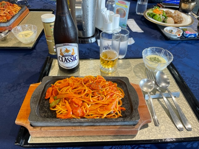 着換えて、レストランへ。クラシックを飲みながら、ナポリタンを食し、少し練習グリーンで球を転がして南のアウトから。3組でしたが、私たち3名はセルフになりました。ま、しょうがない。青からと思ったが白が良いとのことで白で行くことに。