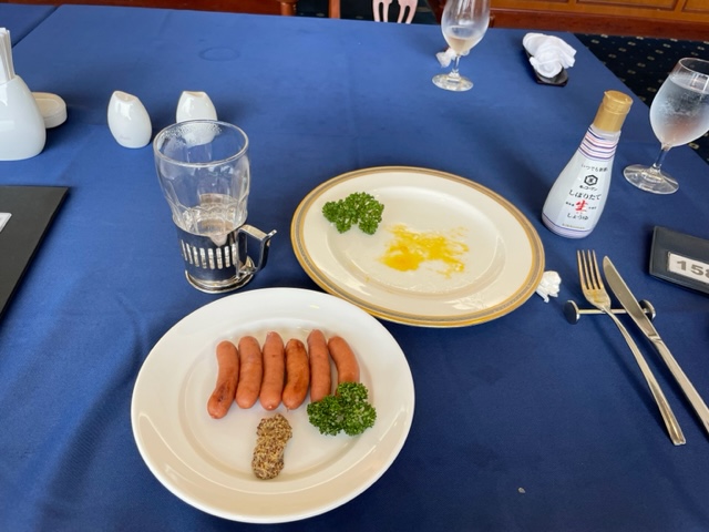 到着後、着替えて、レストランへ。今日は目玉焼きとソーセージを食します。