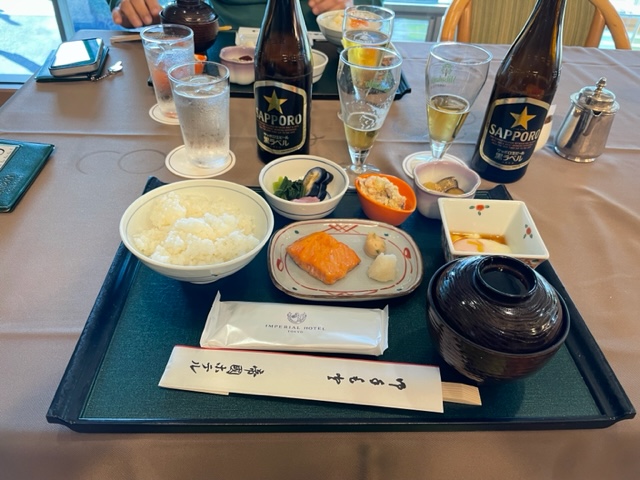 到着後、着換えてレストランへ。タケ小山さんを交えながら皆様と黄金水と和朝食とで歓談タイムです。