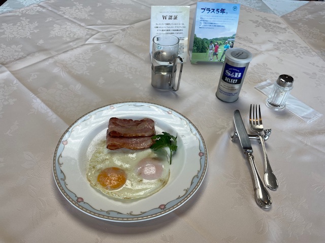 いつものようにベーコンエッグを食し、パターを少々転がして、アウトから。