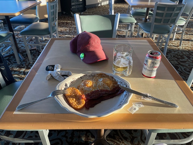 2階レストランへ。よく焼きの目玉焼きとカリカリベーコンとハッシュドポテトを食しながら、バドワイザー2本をいただきます。