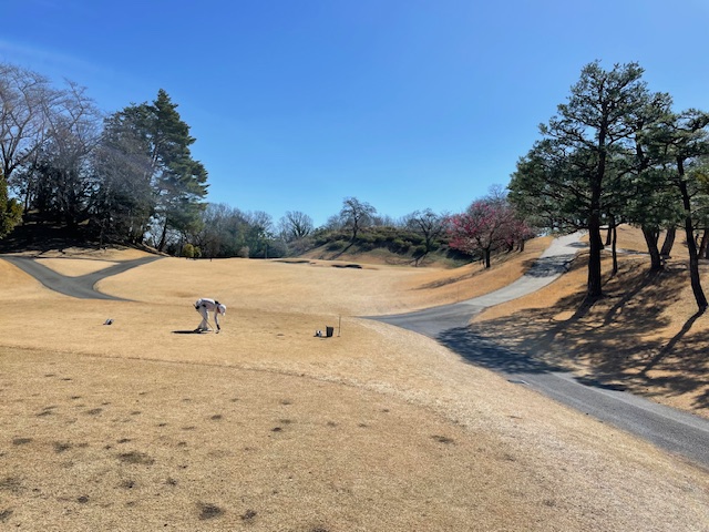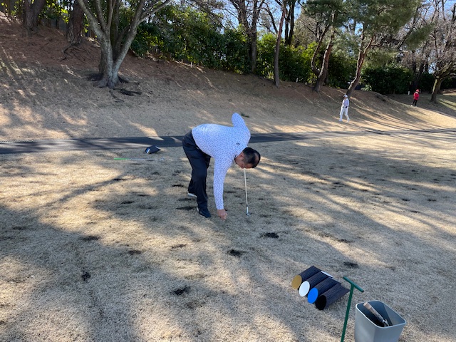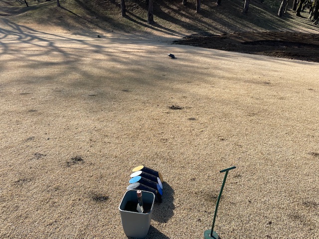 さて、アウトから。府中は今は改造中で、1番ロングはミドルに。6番7番はスキップ。つまりプレー不可。8番長いミドルは、90yのショートに。10番ロングはミドルに。ということでアウトがパー27設定でインがパー35設定。つまりは、16ホールでパー62の設定で臨時営業中です。