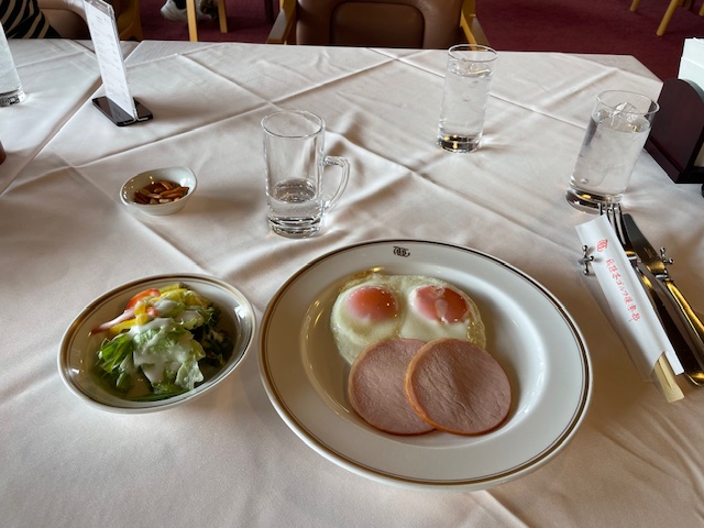 着替えて、レストランへ。縁のT.Sさんのお隣に。そして、Y.Mさんも合流。いつものようにハムエッグとさつま汁をいただく。幸せ~。