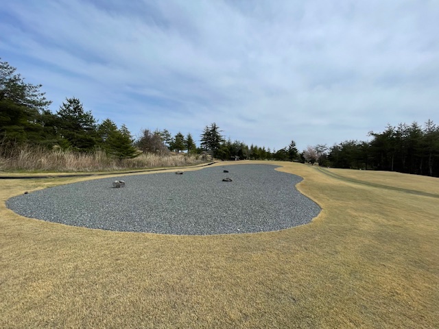 15番ショートは、バンカーインから出ただけ。寄らず入らずダボ。
