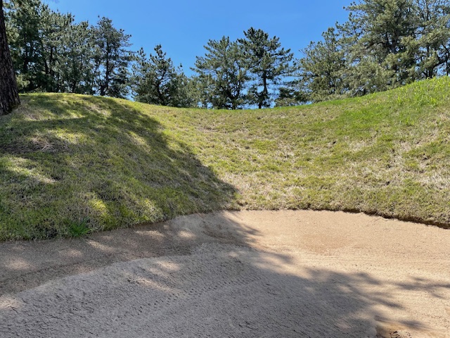 16番ロングは、完璧な1,2打だったが、3打目であのバンカーに入れてしまう。ホームラン。ダボ。