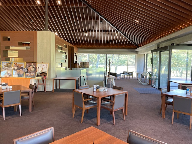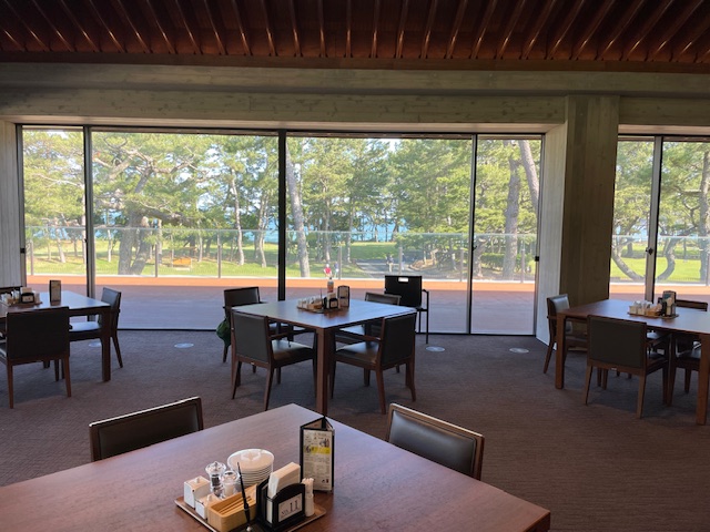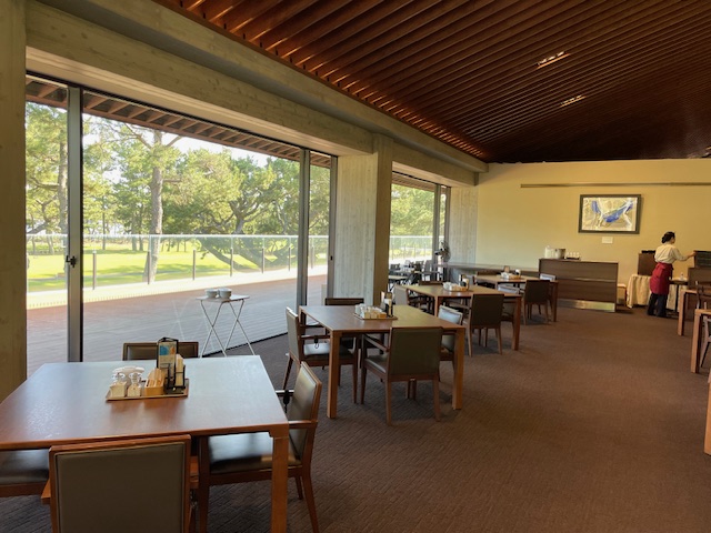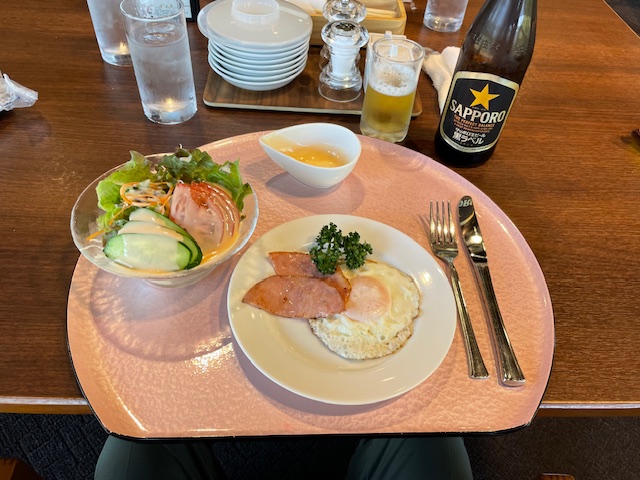 今日は最高のゴルフ日和です。まずは、レストランで腹ごしらえです。黄金水とハムエッグとサラダでまったりと。