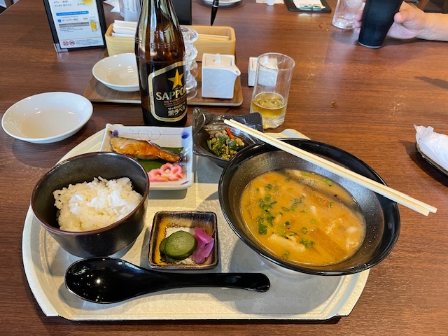ランチは、黄金水とつまみ。その後は、豚汁定食をいただく。