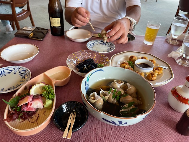 ランチは、バイガイ、シューマイ、やきそば、鯖寿司等々をシェア。なかなかグッド。
