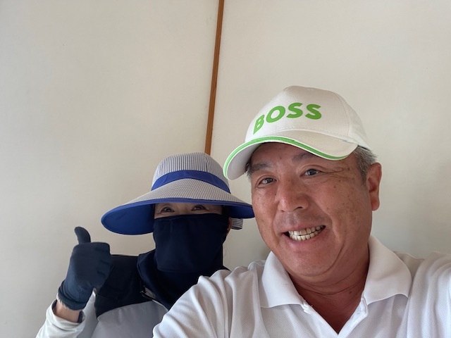 アウト1番からティオフ。今日は白ティです。