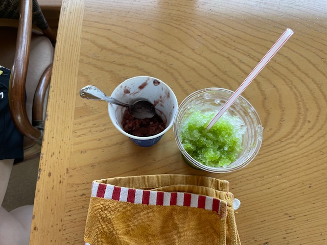 茶店で休憩。抹茶味のかき氷を食す。ナイス。