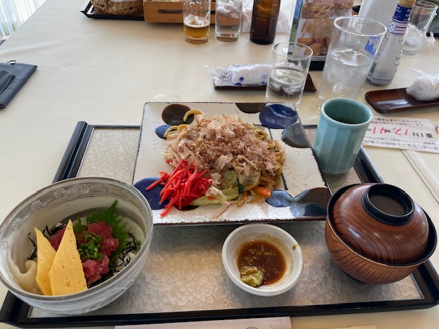 ランチは、今日は焼うどんとマグロ丼のセットを食す。まずまず。