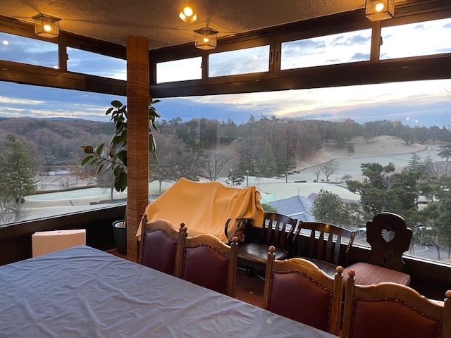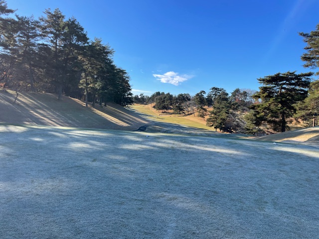 ちょいと作業と朝風呂タイム後、朝食。霜がおりてる練習グリーンで球を転がして、インから。今日は青ティでグリーンは山吹です。