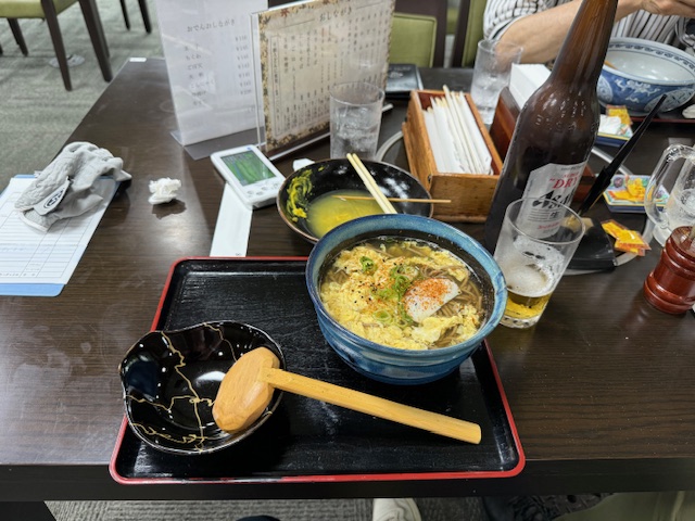 ランチは、土日しか開いてないという茶屋に行かせてもらう。どうせなら、って思いリクエストしました。おでんと瓶ビール大瓶を頼みます。やはり、名門にはおでんと瓶ビールの大瓶が似合います。おでんの牛筋が美味い!で、ついでに卵とじ蕎麦もいただく。薄味でありましたが、ナイス。