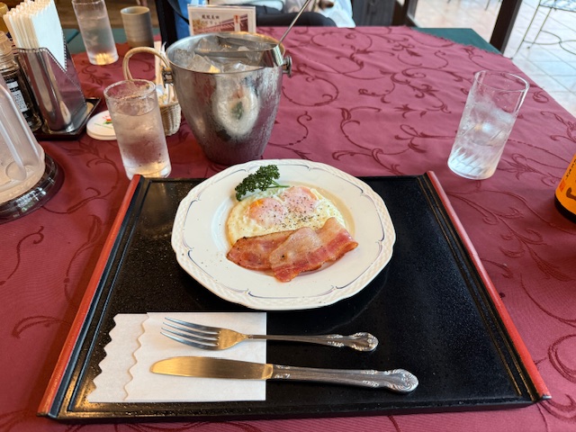 7時15分にはレストラン入りし、ベーコンエッグと豚汁をいただき、8時のトップでスタートします。