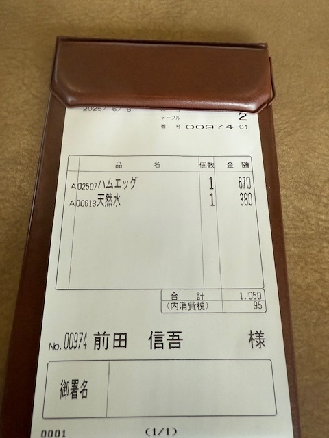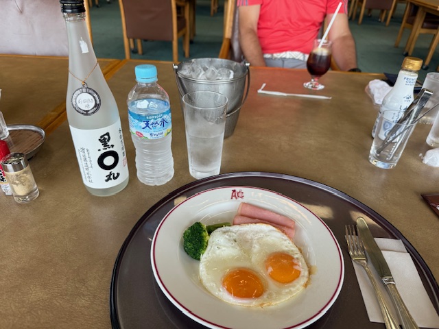 6時25分過ぎに到着。市川支配人と池村副支配人にご挨拶。6時半にフロントで署名し、6時40分に着替えてレストランへ。まだ、私のボトルはありました。ハムエッグをオーダーし、作って来ますか?と言われましたが、ハイお願い!って言いましたが、滅多に来ないくせに悪いかな?と思った私は、自分で作ります!って申し上げました。水割りセットが出てきたら、お水まで付いてました。すげ~な~って思いましたが、いや待てよ、これはもしかしたら料金が掛かっているのでは?と思い、伝票を見たら天然水380円の刻印が。。。後ほど、女性スタッフに尋ねたら「昨年からそうなりました」「もし、作ってきてもらったら?」「それだと無料です」「なんだよ~。早く言ってよ~」。しかし、炭酸を頼んだ折に炭酸の料金を徴収されてることはありますが、水割りを頼んで水代を徴収されたのはゴルフ場で初めてでした。でも、今見たらHPには書かれてました。あと、胡椒が固まってて出て来ませんでした。(笑)。ちょっとこれはいけませんね。
