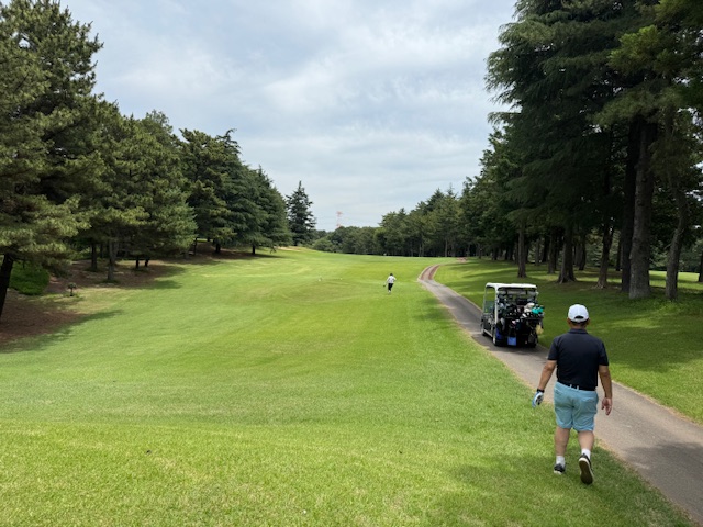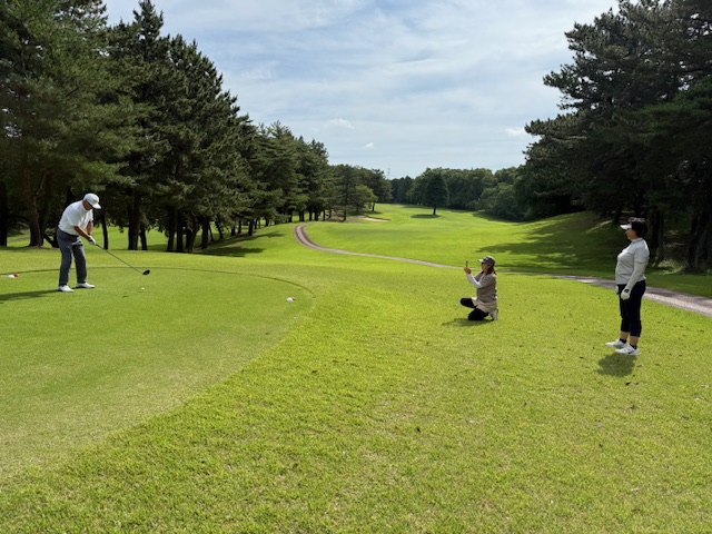 我々はイン10番から。使用ティは私とK.Tさんは青。レジェンドK.Kさんと今日ご一緒してくださる内田真由美プロは白ティからです。