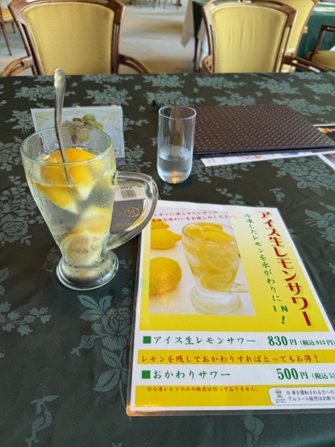 到着時の気温は23度。素晴らしい。到着後、着換えてレストランへ。うどんと生レモンサワーを頂きます。