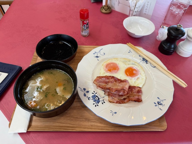 まずは、いつものように豚汁とベーコンエッグからスタートです。今日はXで「ここはどこでしょう」クイズを出す。