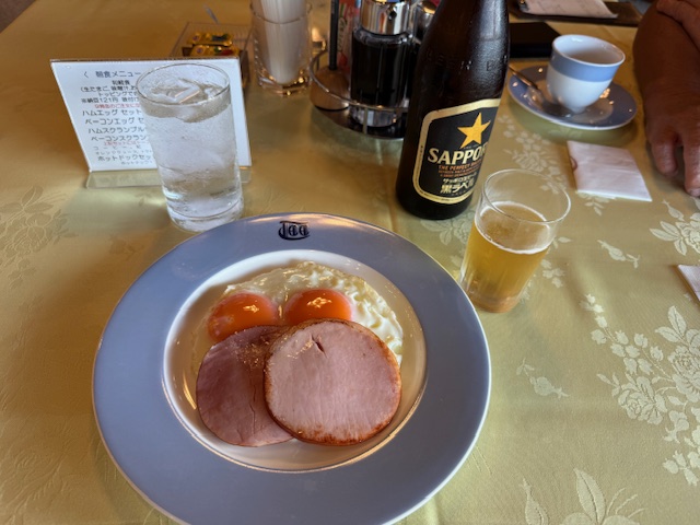 到着後、受付業務を始めて、その後、引き継いでレストランへ。ハムエッグを食しながら談笑会。