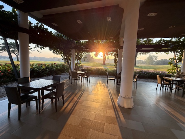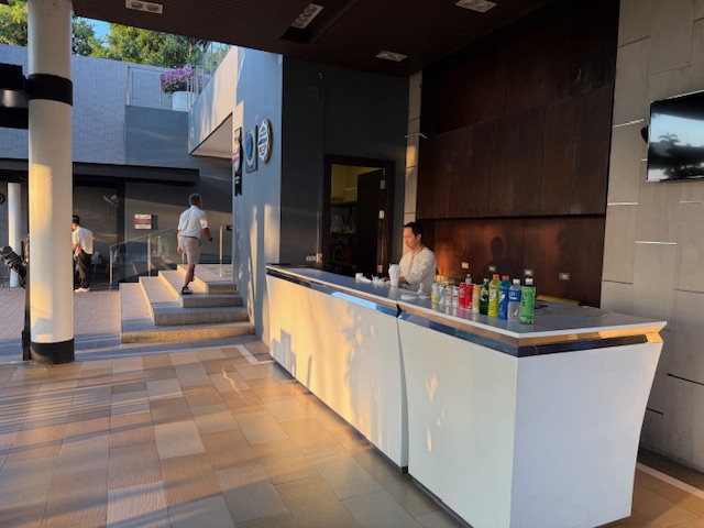 着替えて、まずは、オープンテラスへ。私はここで目玉焼きとベーコンとトーストと黄金水をいただきます。ここでまたまた妙なご縁が。今日の同伴プレーヤーのM.Iさんのお知り合いのKさんと「エエ~!こんなところで!」そう、ワゴンで出ていたそのKさんとバッタリ遭遇したんです。