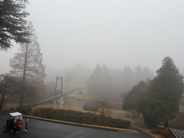 霧が凄く、また、弱い雨が降ってます。こんな霧は初めてです。