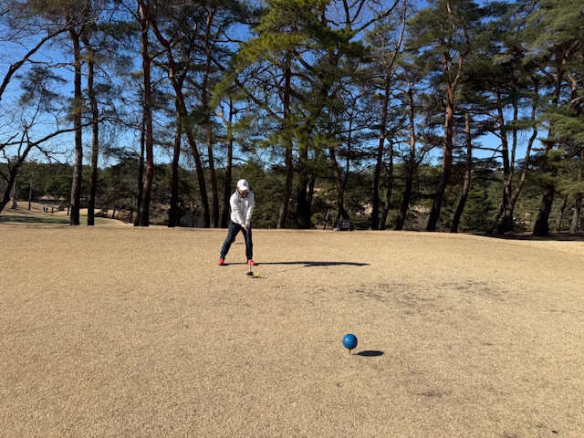 いつものようにレストランでハムエッグを食しながらミーティングをし、パターを転がして中コースから。Aグリーンで、ティは青です。今日は青だから、頑張って頂戴。