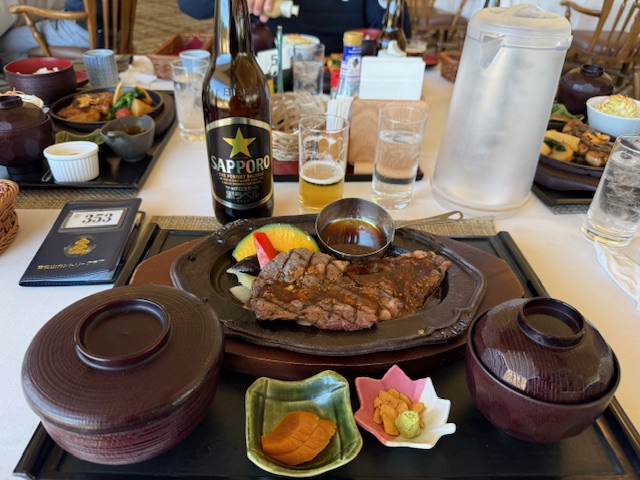 ランチは、奮発して2980円のステーキにしたが、、、。冷めてて旨くない。ステーキはジューって音がしてないと。。。