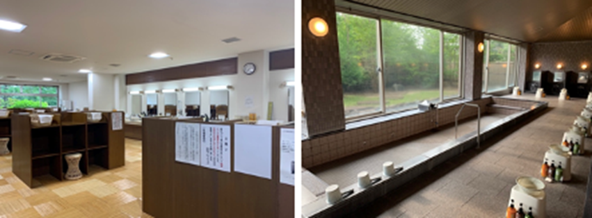 ■男子脱衣室(左)と朝営業前の男子浴室(右)