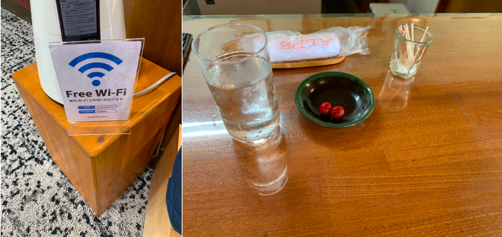 ■館内はWiFi完備(左)、茶店のおしぼり・小梅のサービス(右)