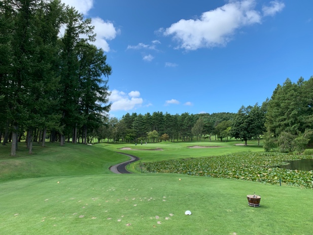 最初のホールは、蓮の葉茂る池とバンカーが効いた短めなパー3です。