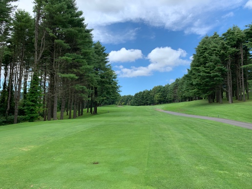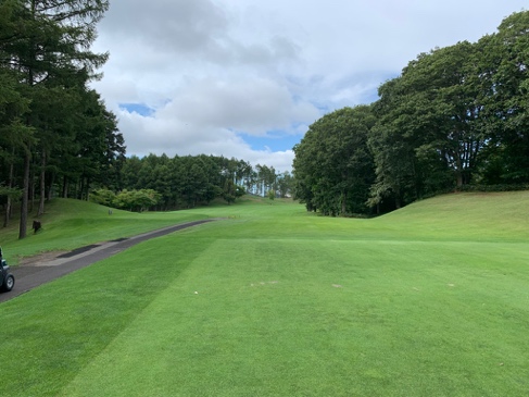 コースを折り返してやや打ち下ろしのホール、ティーショットの着地地点は右側山裾がフラット、ややフェアウェイ左に傾斜して、左の木は段下になり木の左は浅く危険です。
