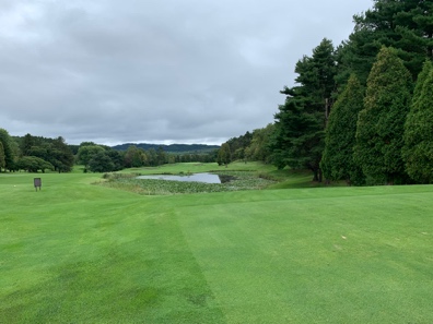 池越えのティーショットで景色は抜群、Aグリーンは長めで真っ直ぐ正面にあります。