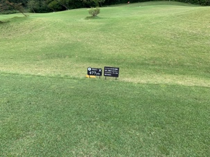 (左)センター狙い、左はバンカーまで右はOK?いや木・ラフ・マウンドや斜面でトラブルの恐れあり。