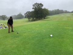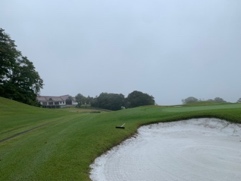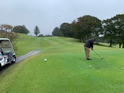 降りしきる雨の中、果敢にストレート方向のバンカー越しを狙う同組のN氏です。