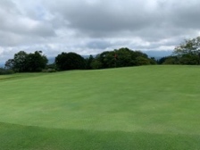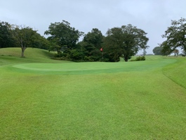 (右)砲台で受けている広めなグリーン、アップヒル花道からアプローチです。