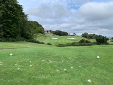 (右)左ドッグレッグのブラインドホール、やや左目狙い近道です。