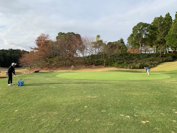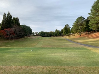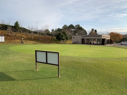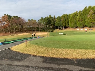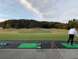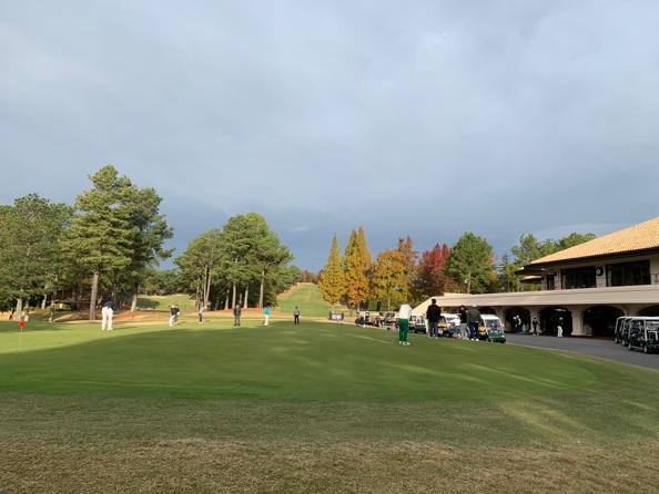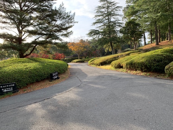 倶楽部ハウスの前に広がるコースを見渡す広大な練習グリーンで少々転がして感覚をつかみ、練習場に向かう左方向でそれよりも手前を右にそれると、東コースインスタートホールのティグランドが見えてきました。