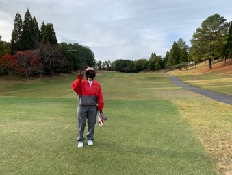 本日担当のキャディさんのVサインポーズで記念撮影、六国ラウンドスタートします。