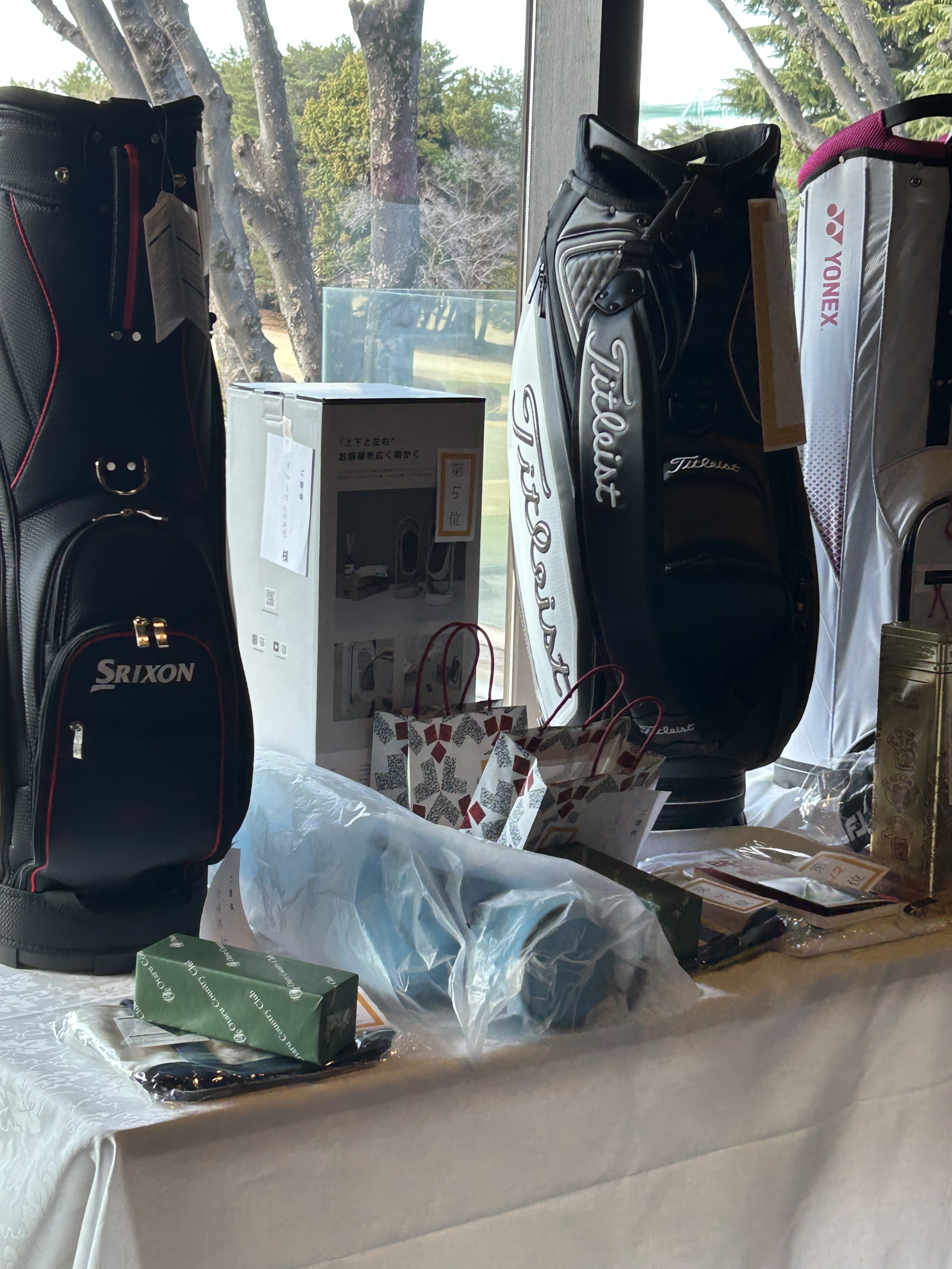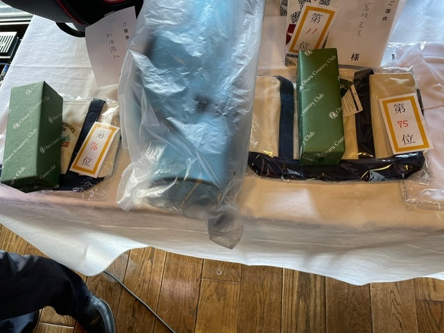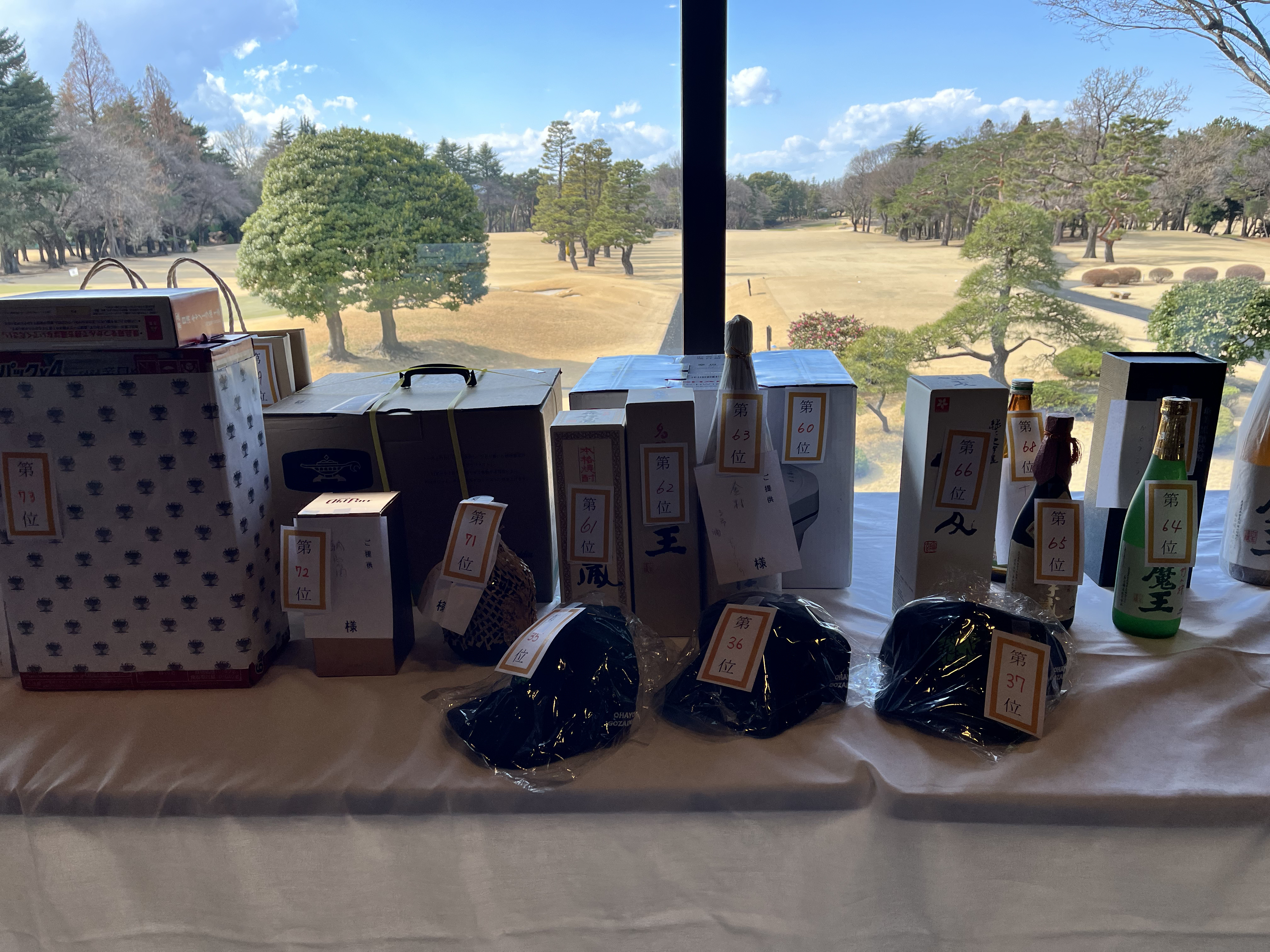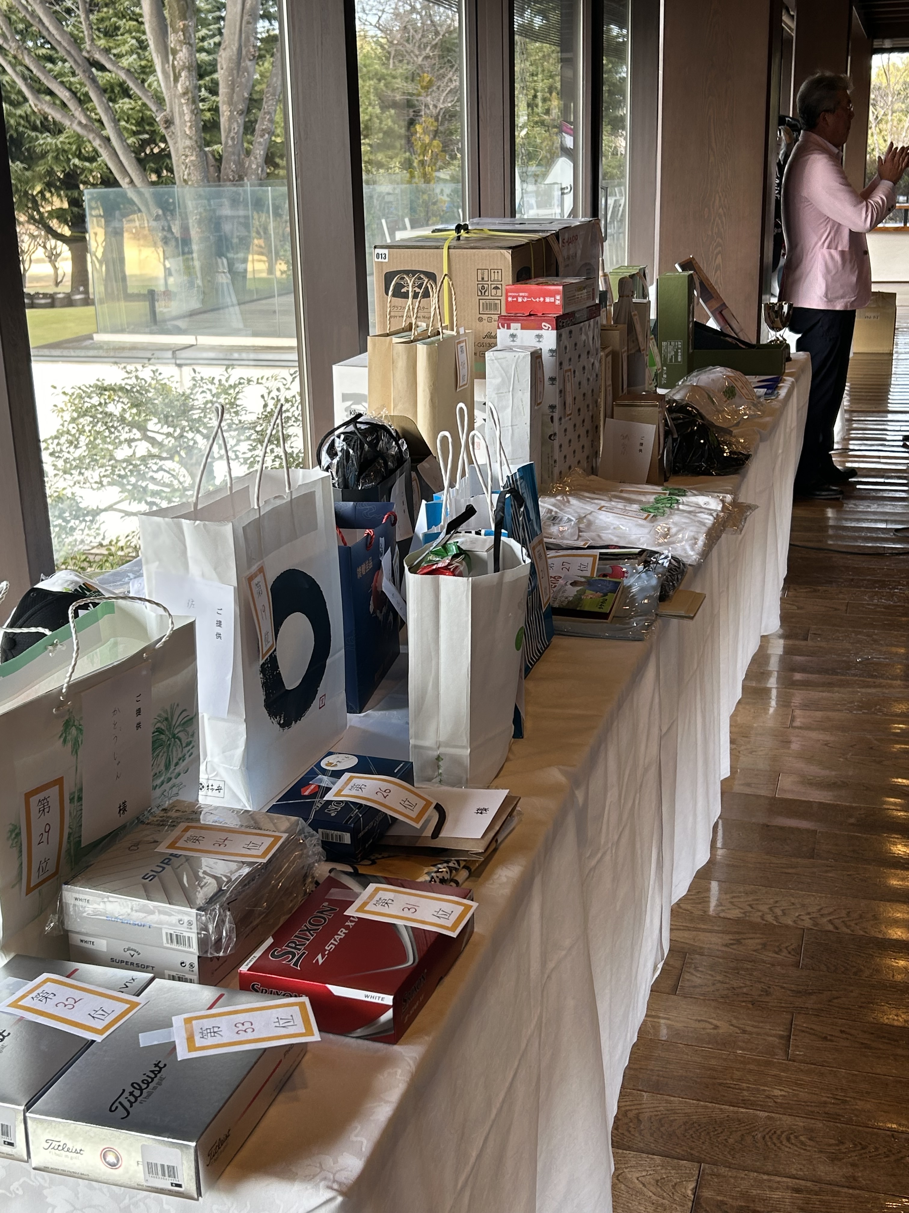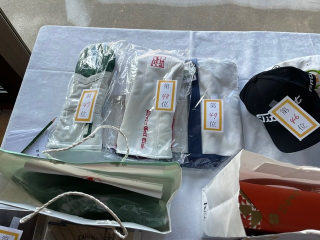 H.Tさん 今半ミートカタログギフト・スコッチウイスキー・ZAITEN・バーディトーリ・セーターおよびポロシャツ・著者:タケ小山プロの本、K.Hさん 商品券、Y.Yさん ビール、F.Sさん COEDO 地ビール、H.Kさん ANAキャップ、K.T&R.Sさん 魔王、M.Cさん 自動調理器、K.Kさん オールドパー、H.Kさん ワイン、M.Hさん サーティワンアイス券、T.Sさん セラミツクヒーター、E.Kさん 相模原シニアオープンチケット(相模原)・森伊蔵、K.Sさん スリクソン キャディバッグ(黒)、T.Mさん 三越カタログギフト、K.Tさん パーリィゲイツ キャディバッグ(黒)、S.Gさん PRGR キャディバッグ(みず色)、K.Sさん メルセデスベンツグッズ・和菓子、M.Nさん 資生堂パーラー・お菓子、I.Mさん 高級鉄観音(お茶)ほか、K.Mさん 酒、巾着、食品、ほか、TV埼玉 テレ玉グッズ、Z.Kさん 川奈スポーツタオル、K.Tさん 森伊蔵、T.Hさん 川間トートバッグ、G.Kさん 奄美大島の黒糖焼酎「弥生」、K.Hさん 焼酎「三岳」、K.Hさん ゴルフボール(タイトリスト・スリプション)、K.Sさん スリクソン・キャディバック、K.Yさん VESSEL キャディバック(シルバー)、T.Nさん オールドパー12年、T.Mさん ゴルフティ