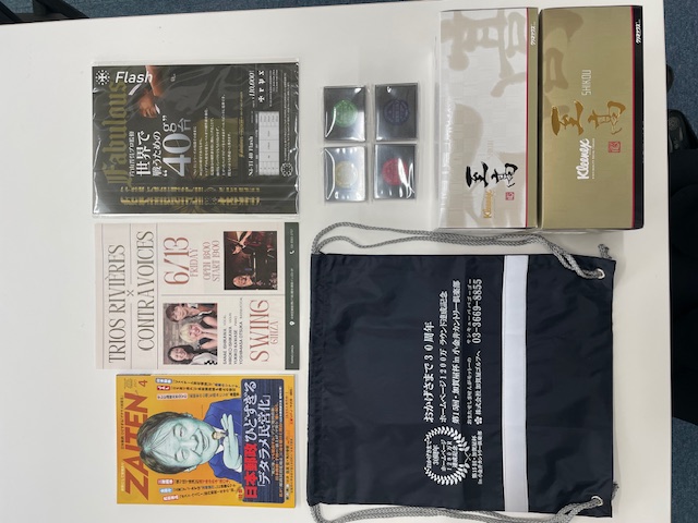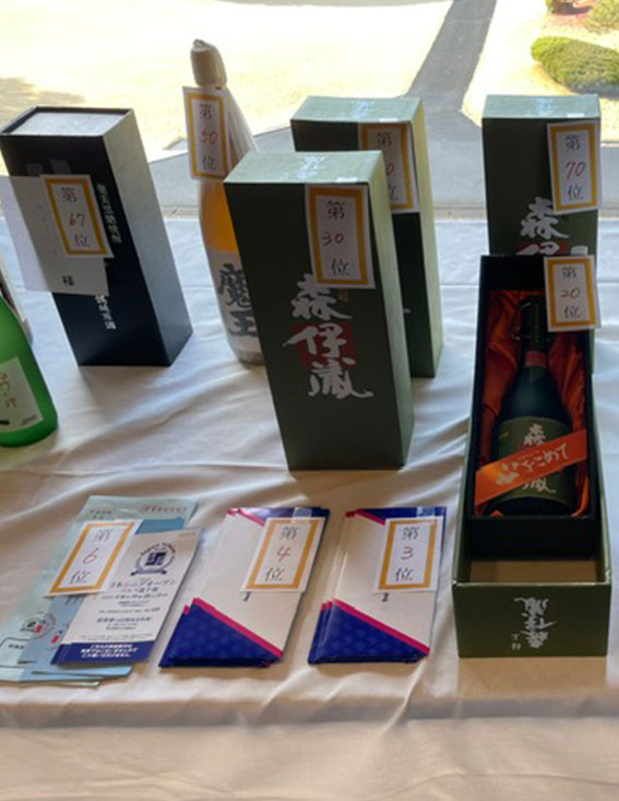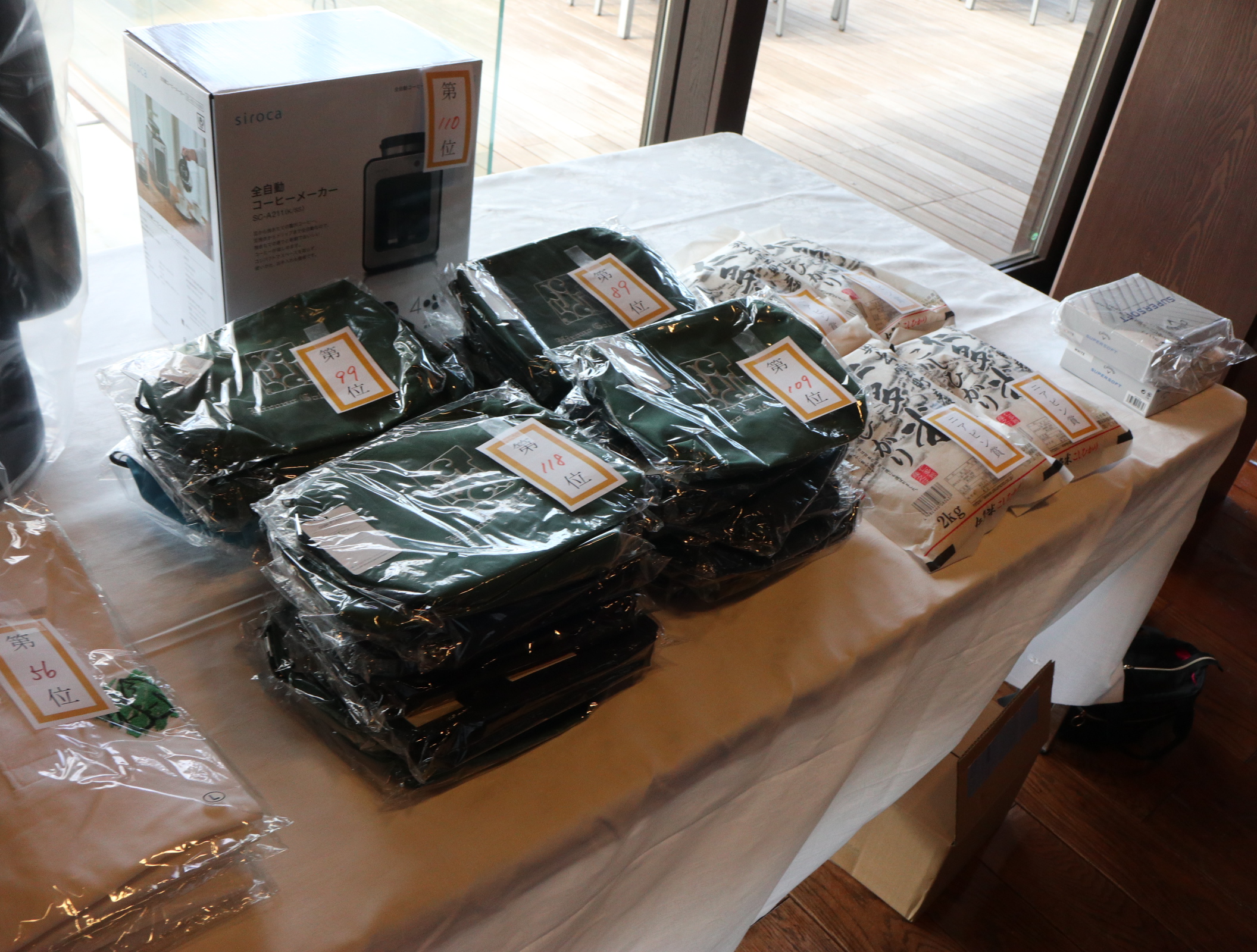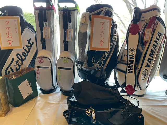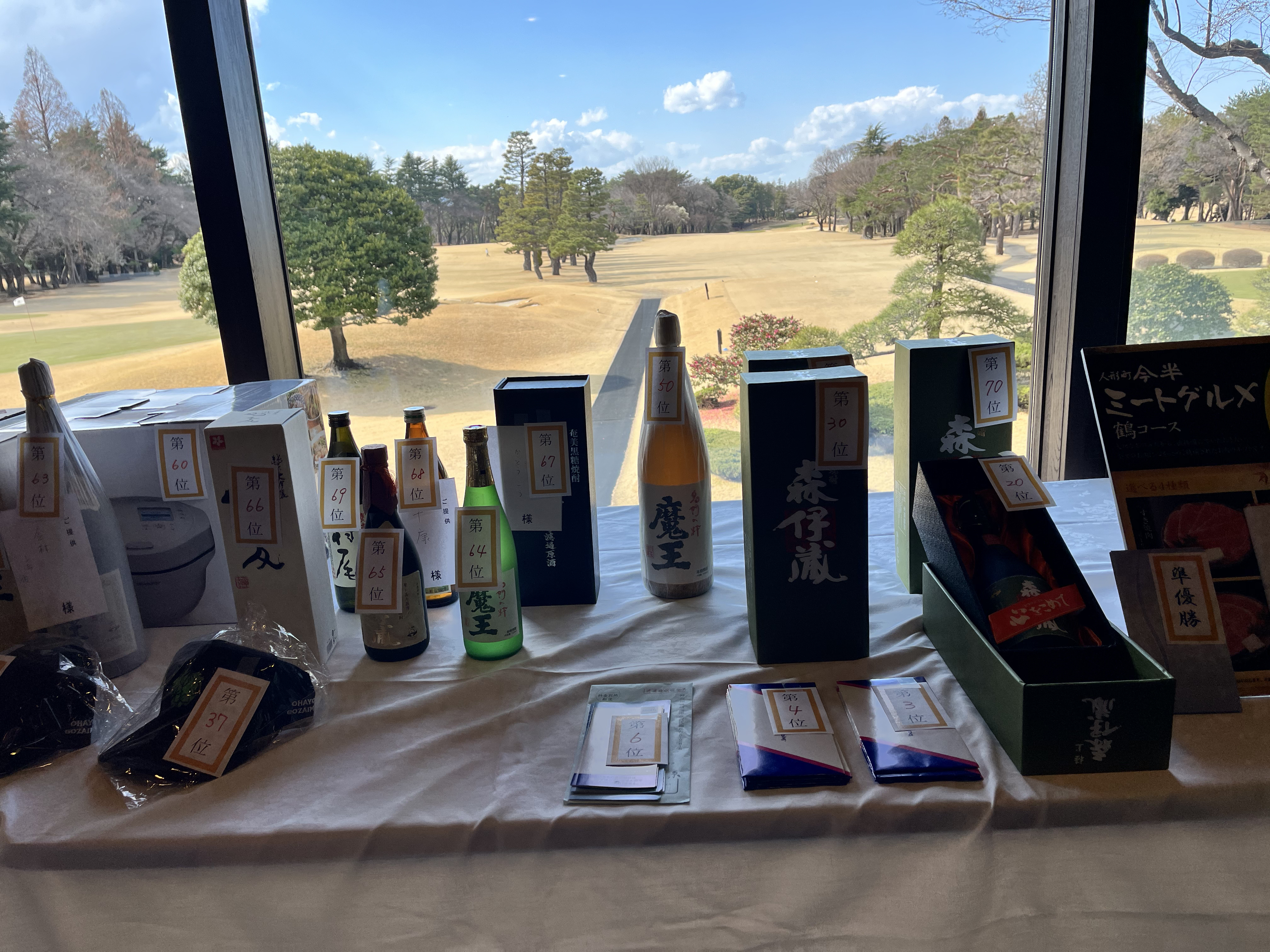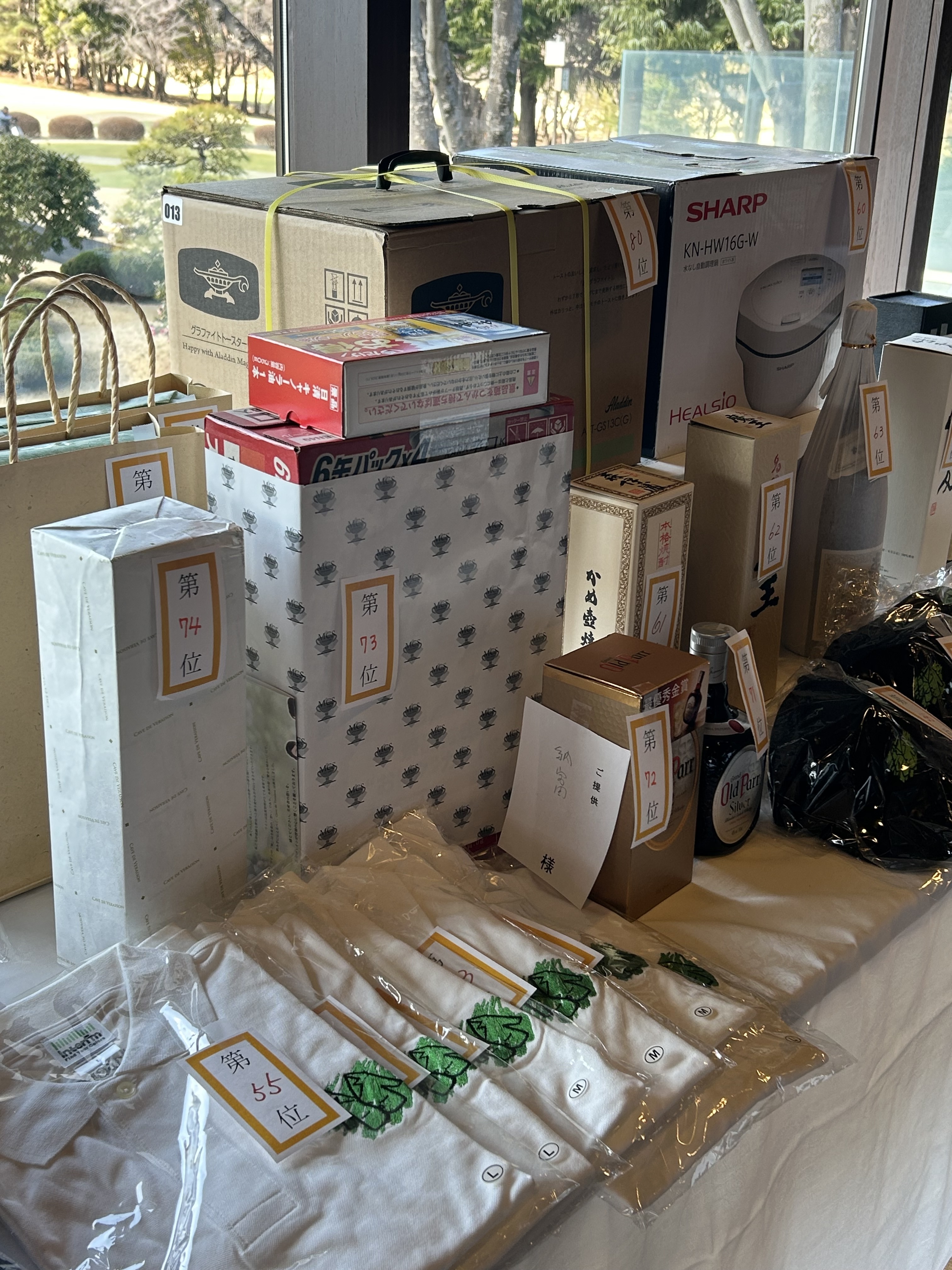 H.Tさん 今半ミートカタログギフト・スコッチウイスキー・ZAITEN・バーディトーリ・セーターおよびポロシャツ・著者:タケ小山プロの本、K.Hさん 商品券、Y.Yさん ビール、F.Sさん COEDO 地ビール、H.Kさん ANAキャップ、K.T&R.Sさん 魔王、M.Cさん 自動調理器、K.Kさん オールドパー、H.Kさん ワイン、M.Hさん サーティワンアイス券、T.Sさん セラミツクヒーター、E.Kさん 相模原シニアオープンチケット(相模原)・森伊蔵、K.Sさん スリクソン キャディバッグ(黒)、T.Mさん 三越カタログギフト、K.Tさん パーリィゲイツ キャディバッグ(黒)、S.Gさん PRGR キャディバッグ(みず色)、K.Sさん メルセデスベンツグッズ・和菓子、M.Nさん 資生堂パーラー・お菓子、I.Mさん 高級鉄観音(お茶)ほか、K.Mさん 酒、巾着、食品、ほか、TV埼玉 テレ玉グッズ、Z.Kさん 川奈スポーツタオル、K.Tさん 森伊蔵、T.Hさん 川間トートバッグ、G.Kさん 奄美大島の黒糖焼酎「弥生」、K.Hさん 焼酎「三岳」、K.Hさん ゴルフボール(タイトリスト・スリプション)、K.Sさん スリクソン・キャディバック、K.Yさん VESSEL キャディバック(シルバー)、T.Nさん オールドパー12年、T.Mさん ゴルフティ