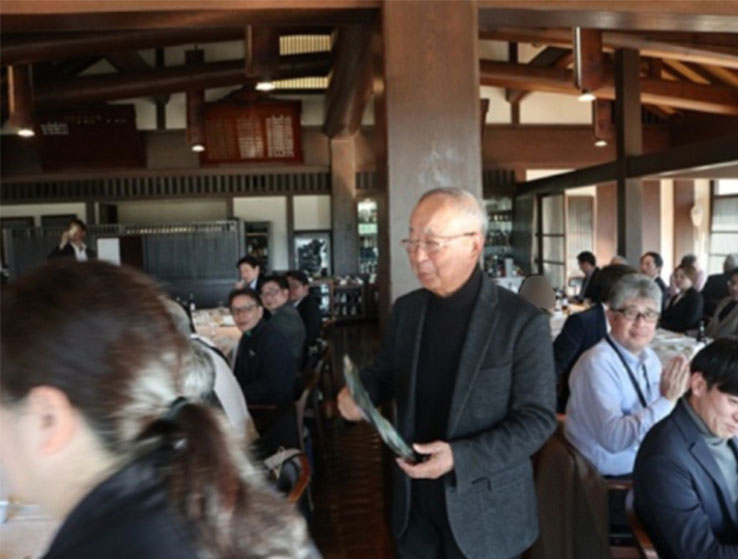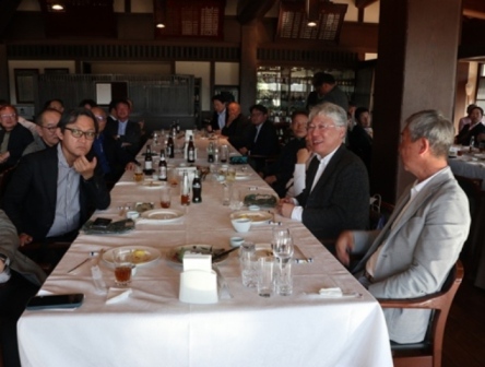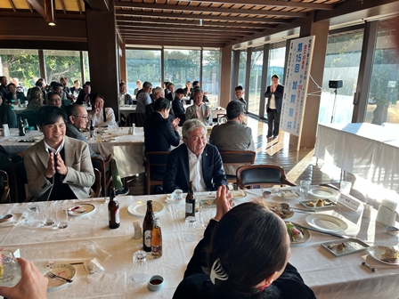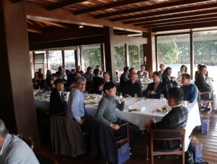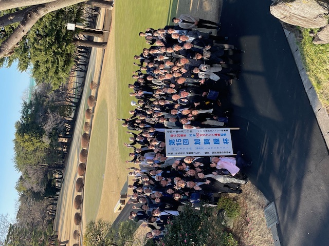 最後は外に出て参加者の皆様で記念撮影。しかし、大勢いるのでここからは皆様が写真に入りきりません。ここで、加藤プロの機転があり、撮影者は2階テラスに慌てて移動。2階テラスからは全員が写真の枠内に入ることが出来ました。加藤プロ、ありがとうございました。見た目にはわかりませんがこの時は看板が飛ぶくらいの風が吹いてたので数人が看板を裏で抑えていました。