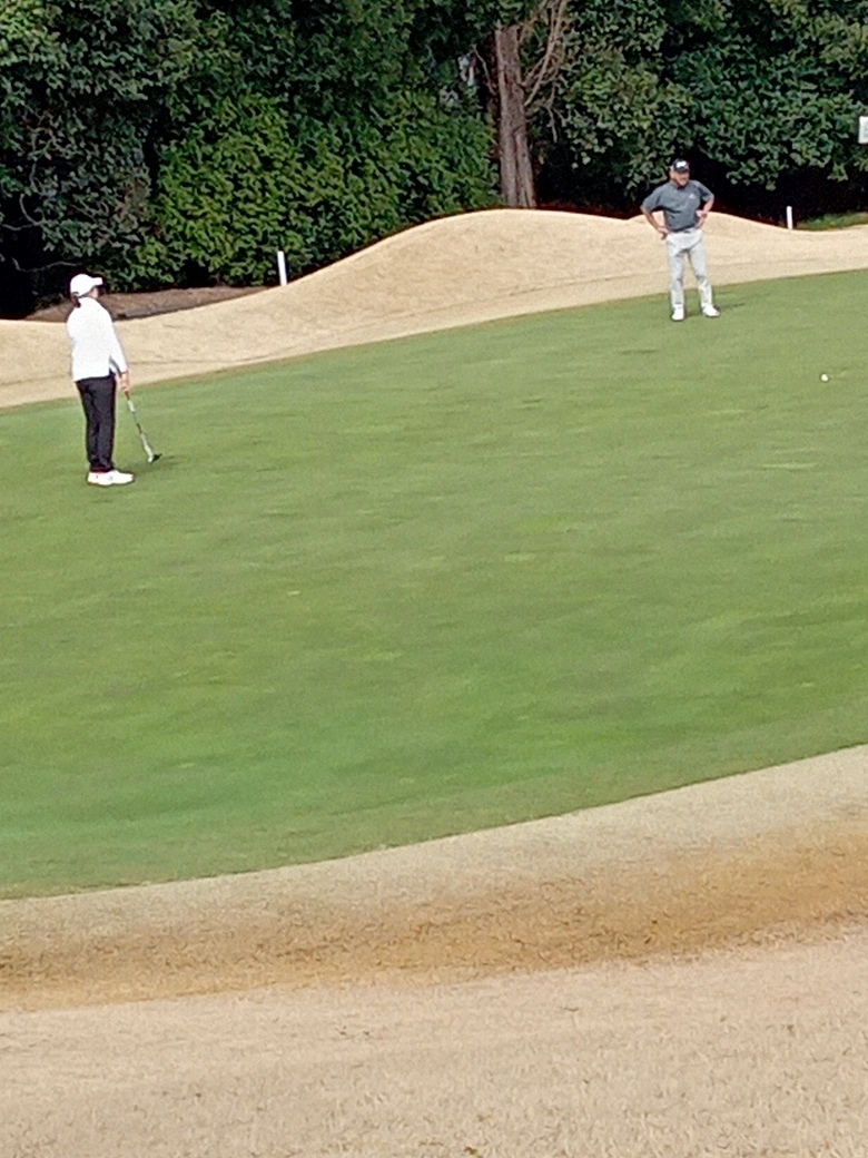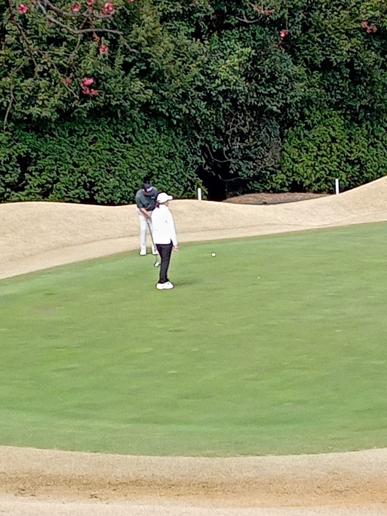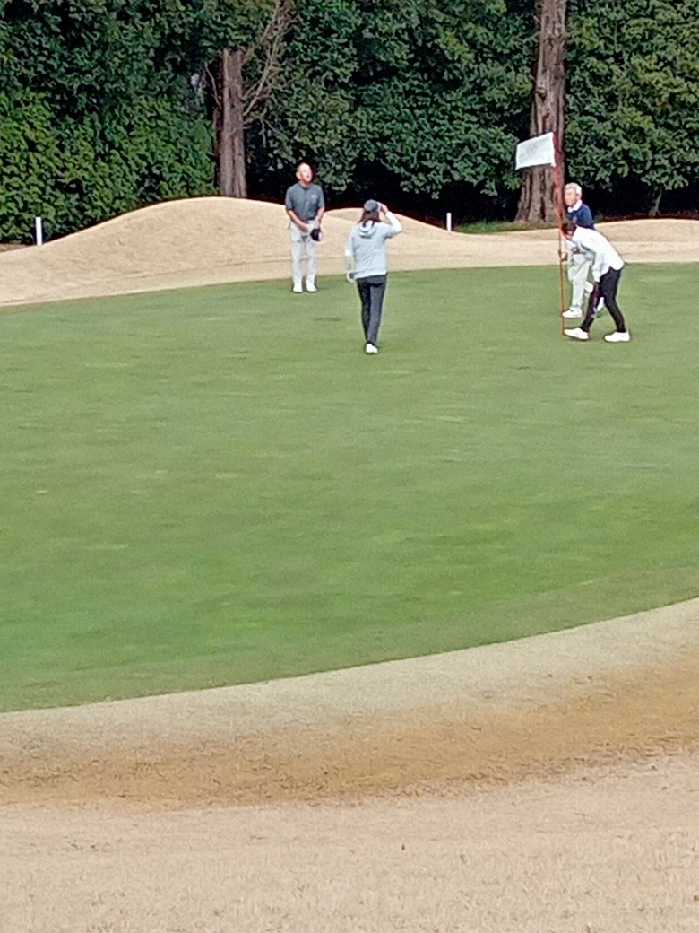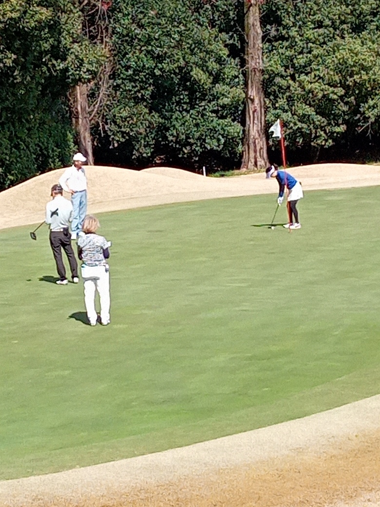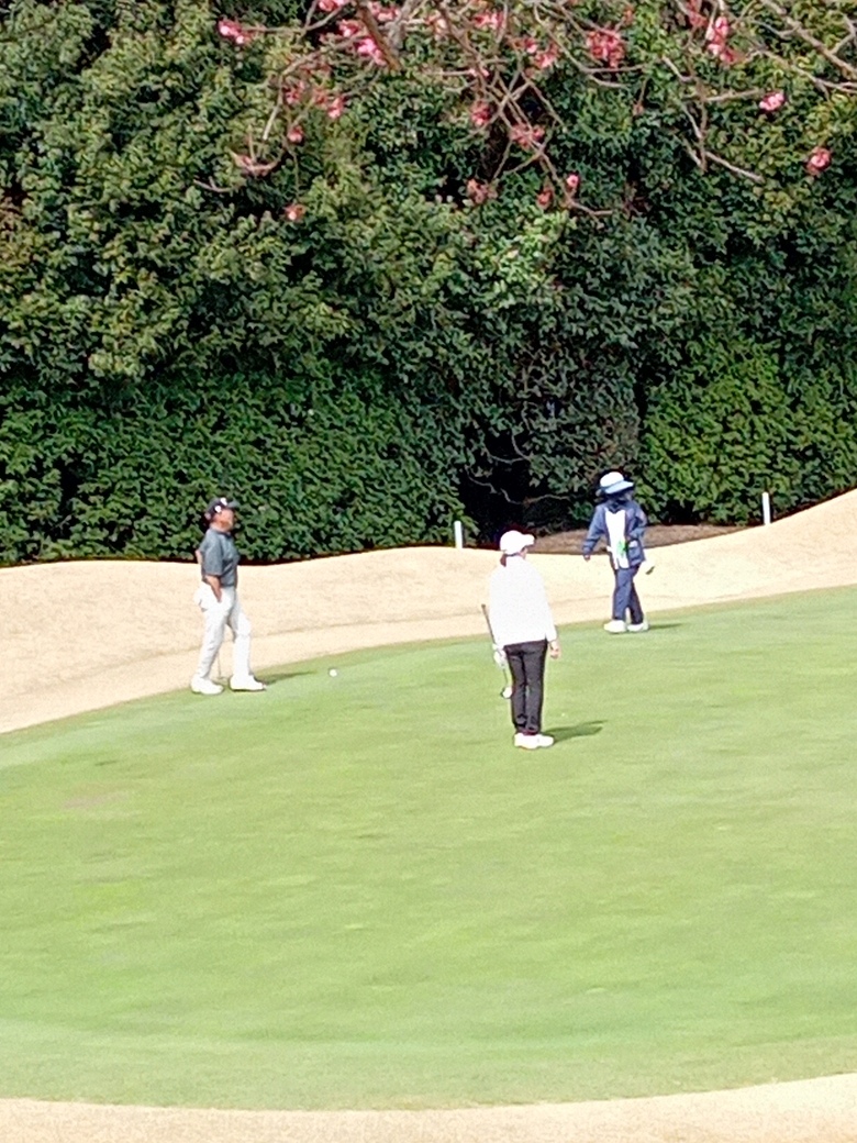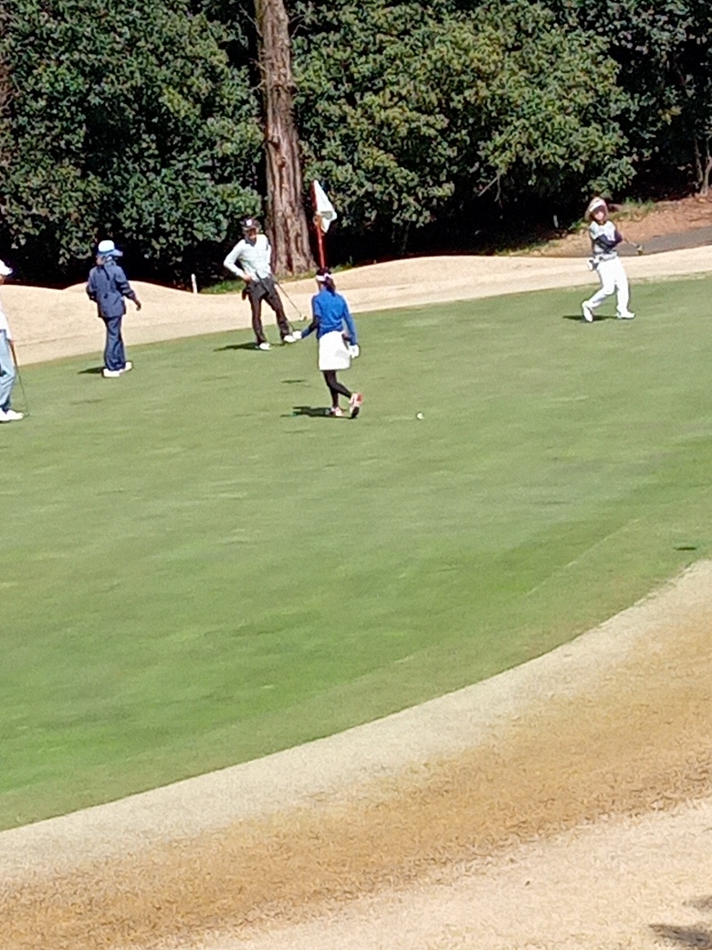 最終組がスタート前にトップ組が18番グリーン前に、村口史子プロのアプローチです・・タケ小山プロがこちらに気付き手を振ってくれてます。