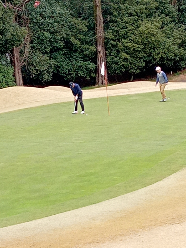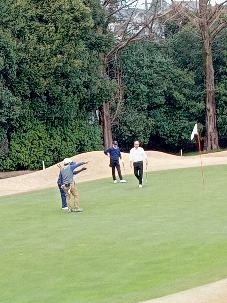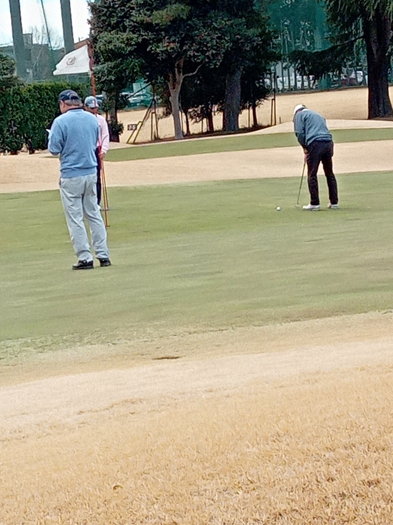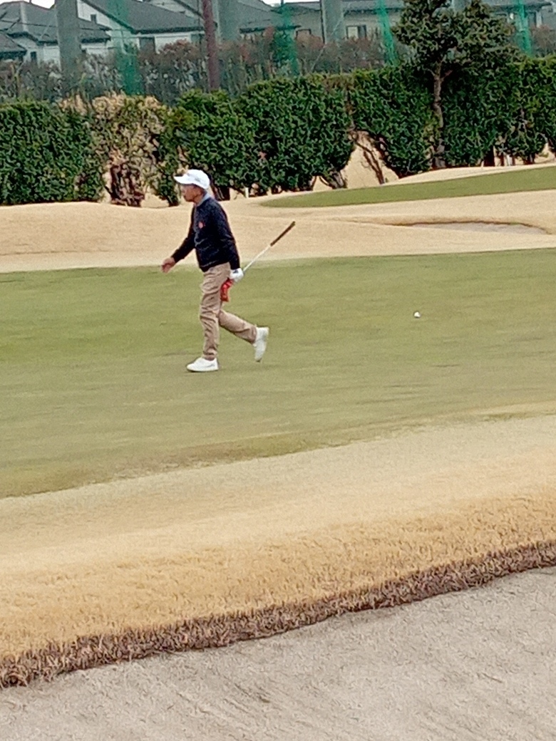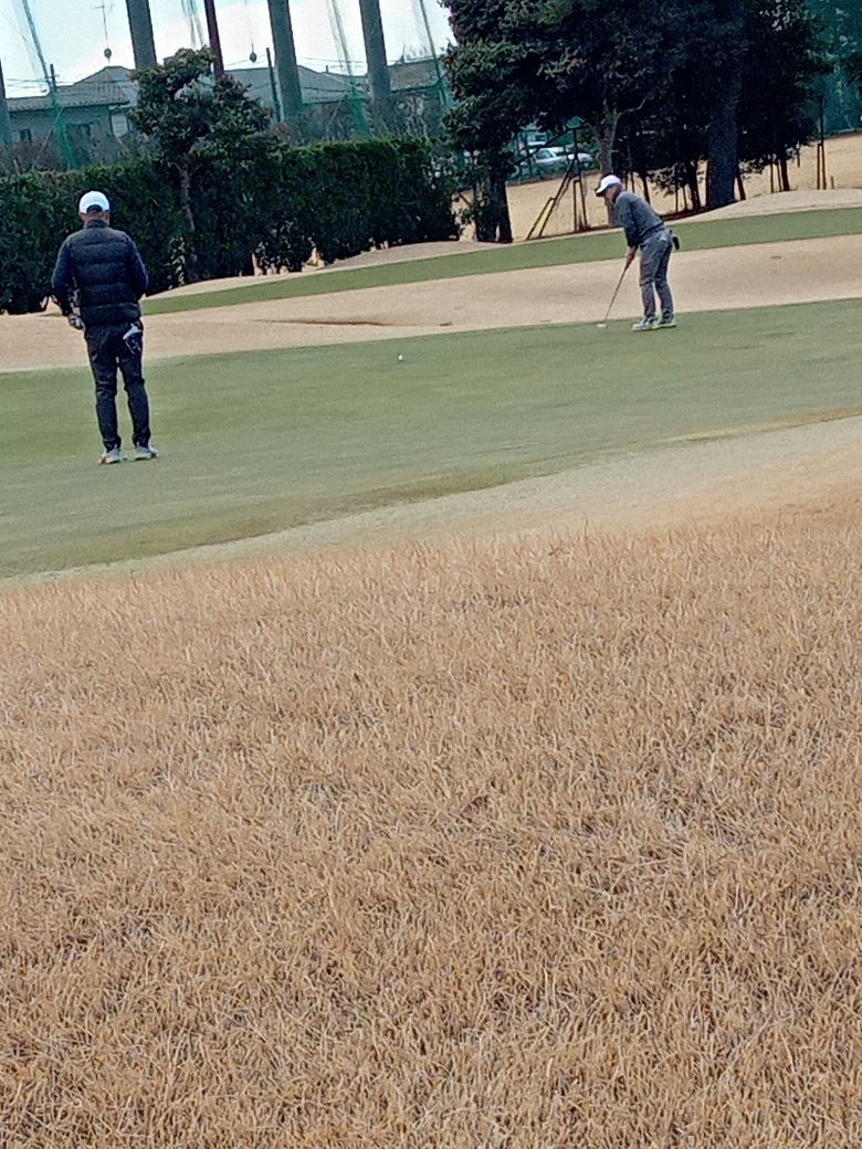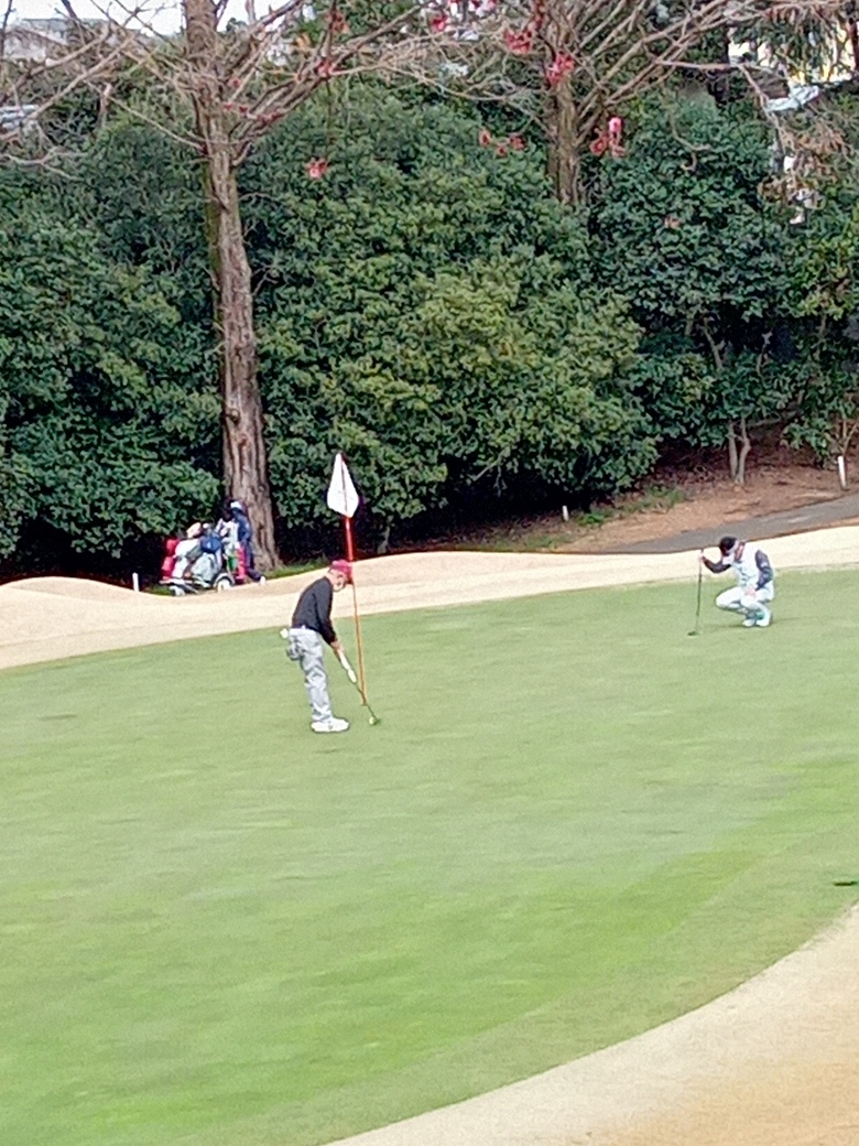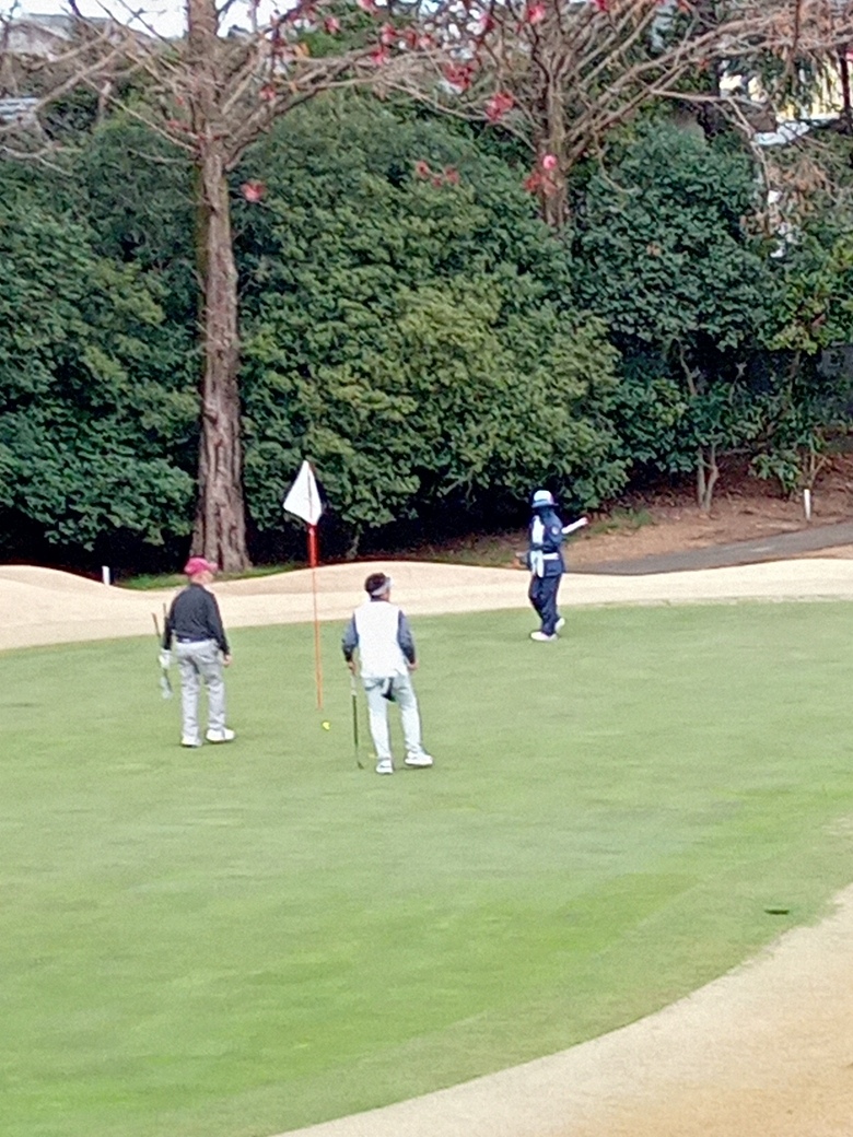 最終組がスタート前にトップ組が18番グリーン前に、村口史子プロのアプローチです・・タケ小山プロがこちらに気付き手を振ってくれてます。