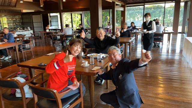OUT1組目にタケ小山プロ&村口史子プロが登場。緊張します。あれ?もう打っちゃった・・予定より5分早い7時45分にアウトトップ組がスタート。2番目にはタケ小山プロ・最後は村口史子プロ、いずれも豪打が炸裂。流石はプロ、打球音、打球の力強さが違います。 あ、しまったプロに見とれてトップチームの集合写真を撮り忘れてしまいました。・・申し訳ございませんでした。午後スタートの写真でご勘弁下さいませ。