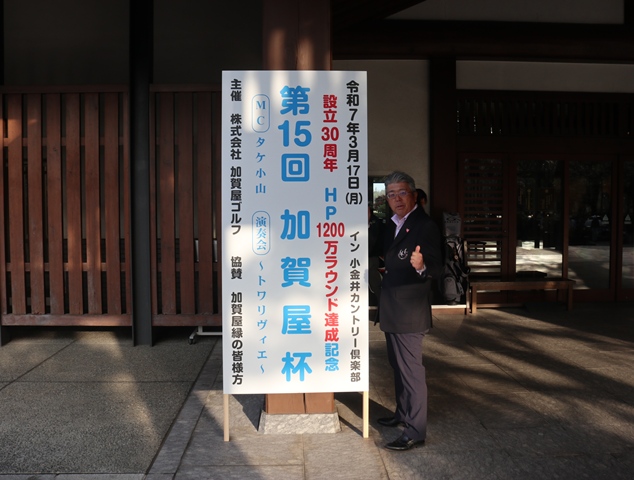 2025年3月17日(月)東京都にある小金井カントリー俱楽部にて加賀屋ゴルフ設立30周年、ホームページ1200万ラウンド記念第15回加賀屋杯IN小金井カントリー俱楽部が行われました。今回は弊社縁のお客様119名にご参集頂き、小金井カントリー倶楽部を貸切っての開催となりました。前日の搬入時にお邪魔した際は寒く悪天候でしたが当日は天候も良く午前中は風もなく正にゴルフ日和でした。搬入時にお手伝い頂きました加藤プロ、Iさんありがとうございました。