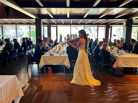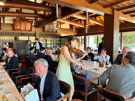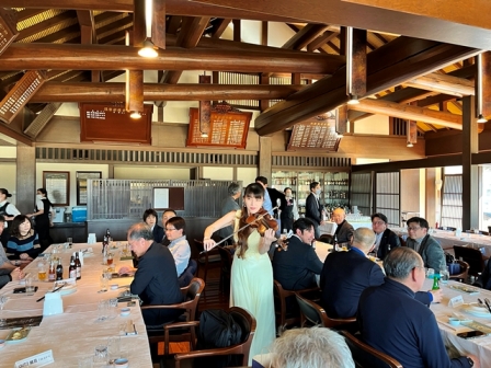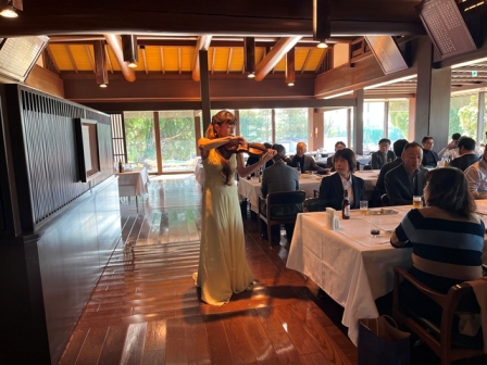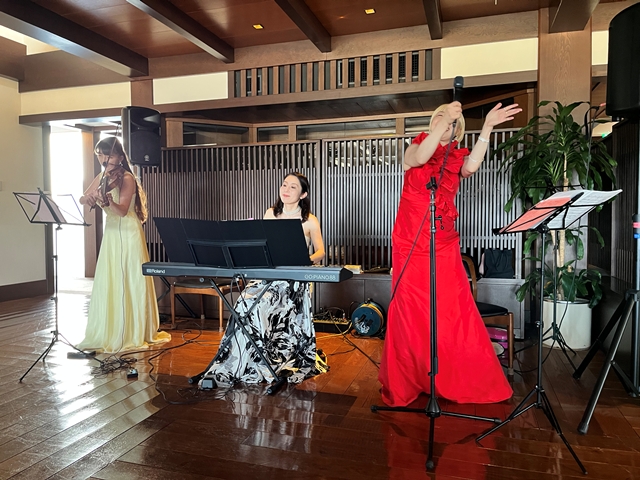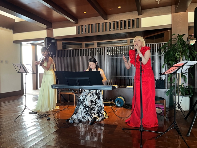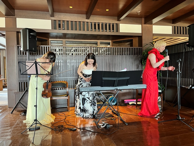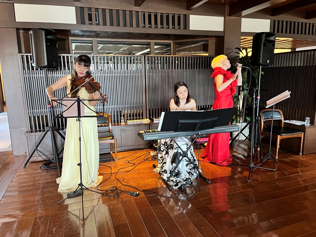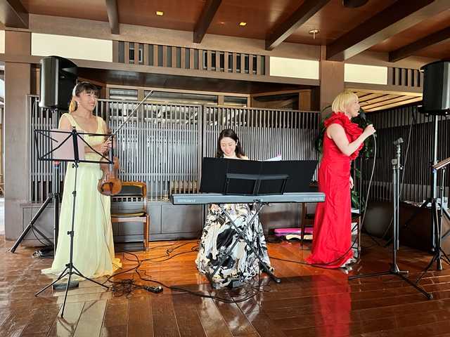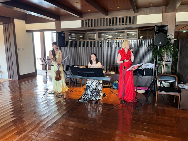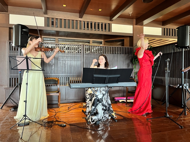 それでは再びトワリヴィエの皆さんの生の演奏&生の歌声に酔いしれていただきましょう! おっと、バイオリニストの石川寛子さんが、続いてヴォーカルの石川早苗さんが、ピアニストの川瀬由紀子さんが・残念ながらピアノは持って動けません・・パーティー会場内を歩きながら、皆様のお近くでバイオンリンを弾き、皆様のお近くで歌声を届けます。会場内を更に盛り上げていきます。