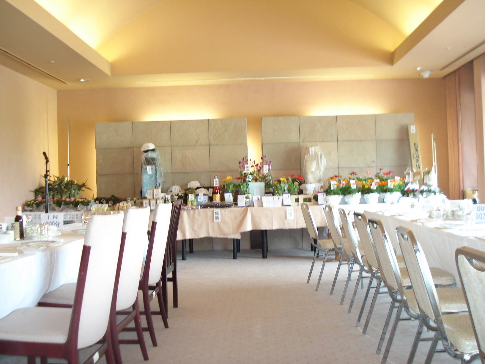 小休憩後、チャリーティーホールの準備に向かうスタッフ。パーティー会場で賞品のセッティングをしながら、米、野菜、本日の主役である?トウモロコシの参上を待っているスタッフ。