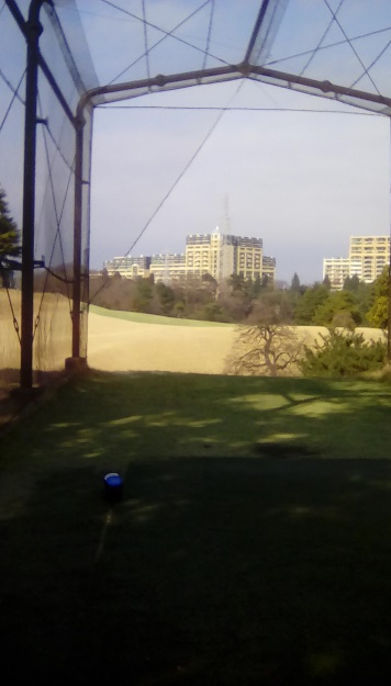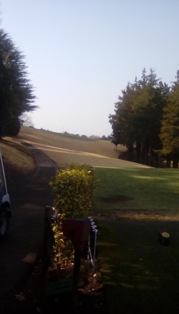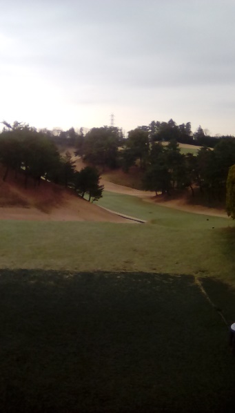 しかし、アップダウンが多く、見通せないホールが多いので龍ヶ崎とはコースの雰囲気がだいぶ違います。随分斜めのフェアウェイ(写真ではわかりにくいですが、目印のポールまでナナメってるし)や鳥カゴからマンションに向かって打っていくホールもあります。鳥かごはネットに触れると無罰で打ち直しできるので、そのおかげでパーゲット。ほんとだったら初球OBだろうな。